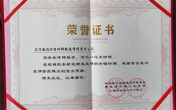 遼寧航達(dá)環(huán)保材制造有限責(zé)任公司抗擊新冠肺炎疫情捐款獲得了鐵嶺縣橫道河子人民政府頒發(fā)的榮譽(yù)證書(shū)